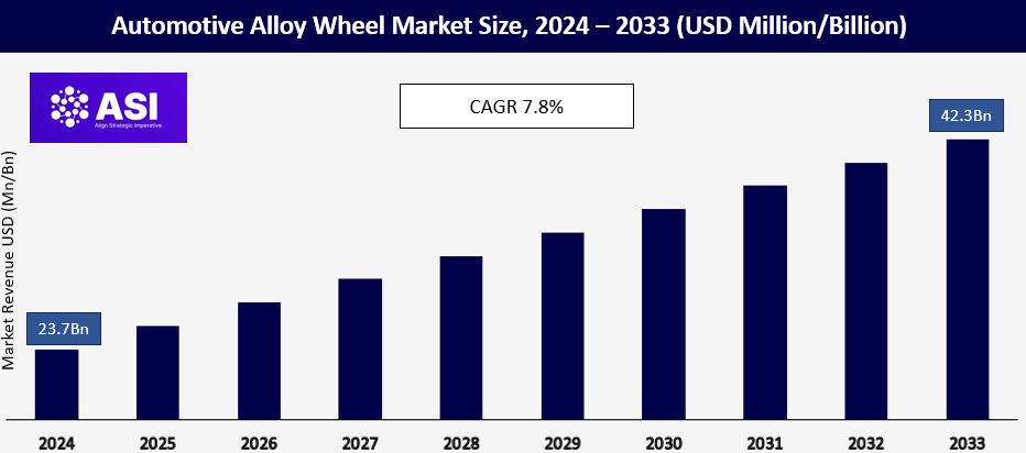 The global Alloy Wheel Market Size was valued at approximately USD 23.7 billion in 2024 and is expected to reach USD 42.3 billion by 2033, growing at a CAGR of 7.8% during the forecast period (2026–2033). The increasing Car Alloy Wheels Demand is primarily driven by growing consumer preference for aesthetically appealing and lightweight wheels that enhance vehicle performance and fuel efficiency. The Automotive Wheel Market Analysis highlights the surge in demand for Alloy Wheels for Cars, driven by their superior durability, corrosion resistance, and improved heat dissipation properties.