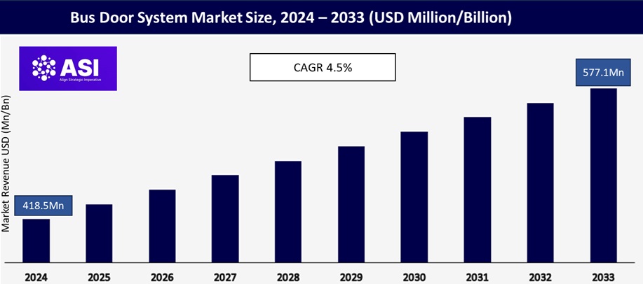 The global Bus Door System Market was valued at approximately USD 418.5 million in 2023 and is projected to reach USD 571.1 million by 2030, growing at a CAGR of 4.5% during the forecast period (2024–2030). Bus door systems are integral components of modern public transportation, enhancing passenger safety, accessibility, and operational efficiency. Increasing demand for automated and semi-automated door solutions, particularly in city buses and intercity transit, is shaping market trends. The adoption of electric bus door systems is rising due to their energy efficiency and reduced maintenance costs, while pneumatic systems remain popular for their durability in high-frequency operations.